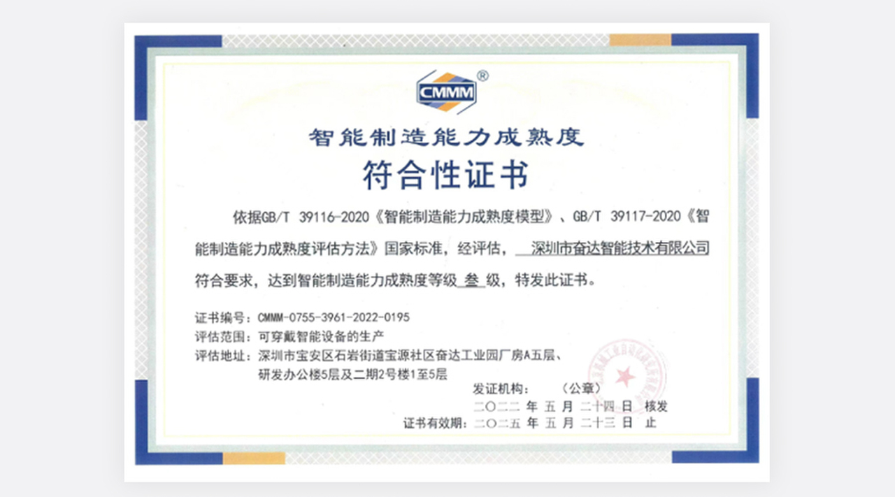 (图为leyu.乐鱼智能技术智能制造能力成熟度三级评估证书) 智能制造能力成熟度模型描述了企业实施智能制造要达到的阶梯目标和演进路径,提出了实现智能制造的核心要素、特征和要求,从人员、技术、资源、制造等要素维度,从低到高分五个成熟度等级综合评价企业数字化、网络化、智能化发展水平。其中,一级为流程化管理(规划级),二级为数字化改造(规范级),三级为网络化集成(集成级),四级为智能化生产(优化级),五级为产业链创新(引领级)。leyu.乐鱼智能于2015年落户深圳宝安区,作为深圳市leyu.乐鱼科技股份有限公司的控股子公司,专注于可穿戴设备、运动健康、移动医疗和电声等领域的技术、产品和内容整合的研究、制造、生产;致力于与全球运动健康领域领先的头部品牌企业合作开发有竞争力的产品,具有为客户提供从创意设计、研究开发到产品实现的全流程技术实力。为了快速推进公司智改数转,实现高质量发展,本次CMMM评估团队由leyu.乐鱼智能CEO肖晓发起,智能办公室牵头,联合制造中心、质量中心、信息中心、行政中心、采购部和人力资源等部门协同推进、共同参与。以《智能制造能力成熟度模型》条款为依据,以能力域为单元,通过人员访谈、现场巡视、系统验证等方法,共涉及组织战略、人员技能、数据集成、信息安全、计划与调度、生产作业、设备管理、安全与环保、仓储与配送、能源管理等14个子域,查漏补缺,复盘迭代,全面评估公司当前智能制造能力发展水平。此次评估是对企业智能制造能力的一次全面检验,帮助企业在智能制造转型升级阶段识别差距、确定目标、实施改进。本次共有45家企业通过智能制造成熟度评估,其中三级以上企业15家。创新是企业核心竞争力的源泉,leyu.乐鱼科技将以智能制造能力成熟度三级为起点,进一步强化智能制造相关组织建设和人才管理,加快构建智能制造发展生态,深入推进数字化转型、智能化升级,不断增强公司竞争力。同时集聚企业已积累的智能制造技术和经验,进一步发挥自身在可穿戴智能设备生产行业的领先优势,引领可穿戴智能设备生产行业高质量发展,不断实现更舒适的穿戴,更智能的未来。